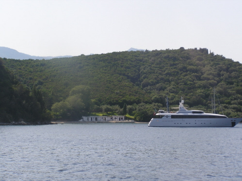Heute geben wir uns noch mal das volle Programm: Amwind, Schmetterling, Flaute, Untiefen-Navigation, auf See baden, Sightseeing der privaten Onassis-Insel Skorpio und Reste essen, was Kühlschrank, Backskisten und Küchenboden so hergeben.