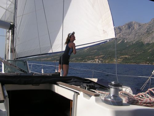 Astrid versucht verzweifelt, es der gestern gesichteten jungen „Meerkatze“ gleich zu tun (geschmeidiges Wesen, weiblich, blond, akrobatisch, flink, überall und stets dort, wo man sie braucht, kompetent, autoritär, dabei verbindlich, entscheidungsfreudig, anpackend, jeder Griff sitzt) – vergeblich, diese mit nichts zu vergleichende Spezies ist bestimmt auf einem Boot gezeugt worden.