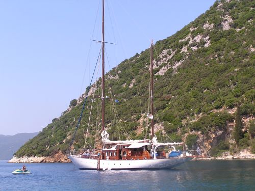Bevor wir heute in neuer Besetzung in See stechen, bewundern wir noch das Ablegespektakel unserer holländischen Freunde von gestern – nicht minder erstaunlich im Vergleich zu ihren Anlegekünsten. Unsere Route führt uns an die Nordküste von Meganision, wo wir uns dem beliebten Freizeitvertreib des Buchtelns hingeben.