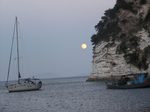 In der Bucht von Ampelakia schließlich gehen wir dann vor Anker – Kapitän und 1. Offizier sind sich zwar heute mal nicht einig, aber der Meuterei wird mit einem Kuss schnell ein Ende gesetzt. Richard zelebriert seine köstlichen Nudeln mit Tomatensauce und das Bier verdunstet schneller als in der 1. Woche. Michael hat dann kurz vor Mitternacht noch eine Auseinandersetzung mit einer Boje, die mit unserem Ruderblatt anbändelt. Trotz heftiger Flüche und einer Messerattacke kann der Zwist aber unblutig beendet werden.