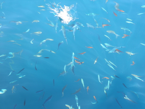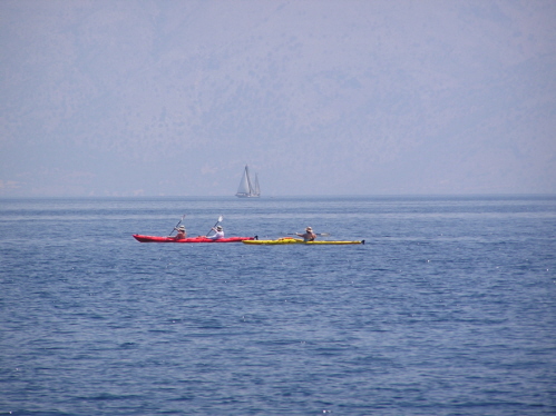 Zunächst wollen wir diesen herrlichen Segeltag aber nutzen und umrunden die Insel Kalamos. Von Am-Wind bis Schmetterling, von 6,8-1,2 kn auf der Logge, von griechischem Salat bis weißem Nougat, von 1001 traumhaften Bucht bis hin zu … einem fliegenden Schwertfisch-Trio. Ganz schöne Brocken, diese Viecher, und irgendwie unheimlich mit ihrer langen Säge vorneweg. Nachdem der Stadthafen von Palairos voll ist, verholen wir uns in die Marina Vounaki, Flottenstützpunkt und Hafen der Clubanlage von Sun Sail – gut geschützt, mit ausreichend Platz, sauber und gepflegt, Top sanitäre Anlagen. Der 10-minüte Fußmarsch am Ufer entlang führt uns ins Restaurant Dionysos, betrieben von einer griechisch-deutschen Familie. Neben guter Küche versorgt uns Sylvia mit allerlei Wissenswertem zu Griechenland im Allgemeinen (Warum gibt es in den Restaurants kein Gyros?) und der Region im Besonderen (Wann öffnet der Bäcker? Wo kriegt man einen Mietwagen her? etc).