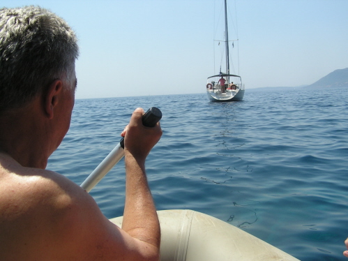 Unser Ankermanöver in der idyllischen, aber Fallböen ausgesetzten Bucht, entlockt dem dort beherbergten griechischen Fischer ein breites Grinsen. Siggi, unser Olympiaschwimmer und Wasserfloh Astrid bringen eine 60m-Leine an Land – sauschwer, wenn nass und eine .. Tonnen schwere Jacht dran hängt – und … üben dann erst einmal Knoten. Als der Palstek endlich sitzt, bringt Franz noch einen 2. Anker aus, um uns für die Nacht die nötige Sicherheit zu geben.