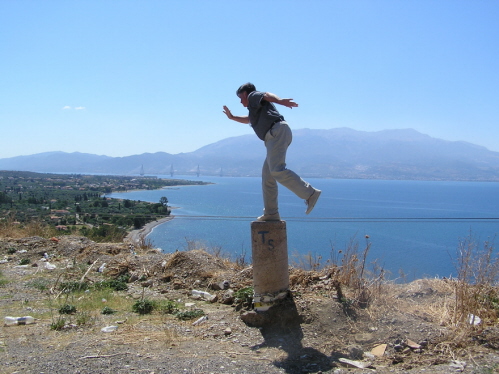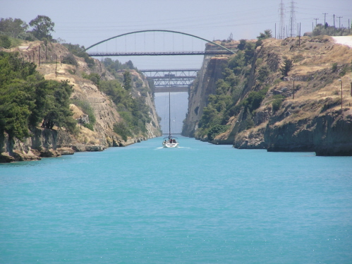 Nach erbitterten Diskussionen gestern konnten wir uns auf die Uhrzeit von 8 (in Worten acht) einigen für „geschniegelt und gestriegelt am fertigen Frühstückstisch sitzen“ – schließlich haben wir Großes vor: Wir wollen zum Isthmus fahren und den legendären Kanal von Korinth anschauen. Whow! Wir haben es nur Cornelias Spürnase zu verdanken, dass wir in den Genuss kommen, dieses einmalige Bauwerk über 6km Länge aus einer Höhe von 80m zu bestaunen. Die Bungyspringer bei ihren waghalsigen Abstürzen zu beobachten, verursacht uns allen allerdings ein kräftiges Ziehen „unterhalb der Körpermitte“ (Zensur der Red.).